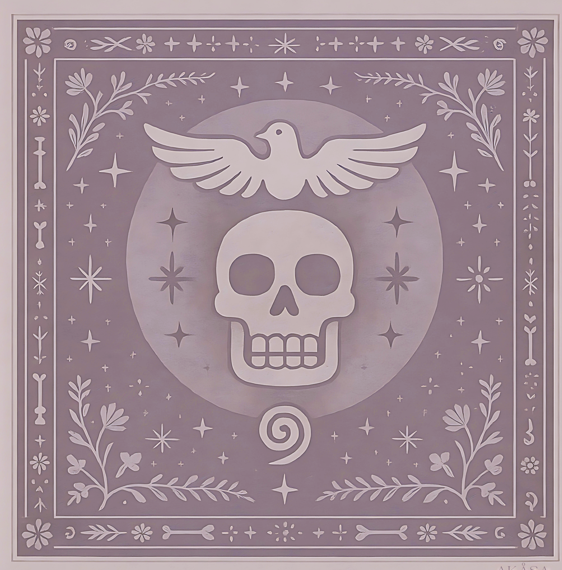 In der Mitte des Schals, a Heiliger Schädel ist von Sternen und Blumen umgeben - Embleme der Erinnerung, des Durchgangs und der gefundenen Licht.