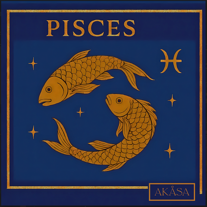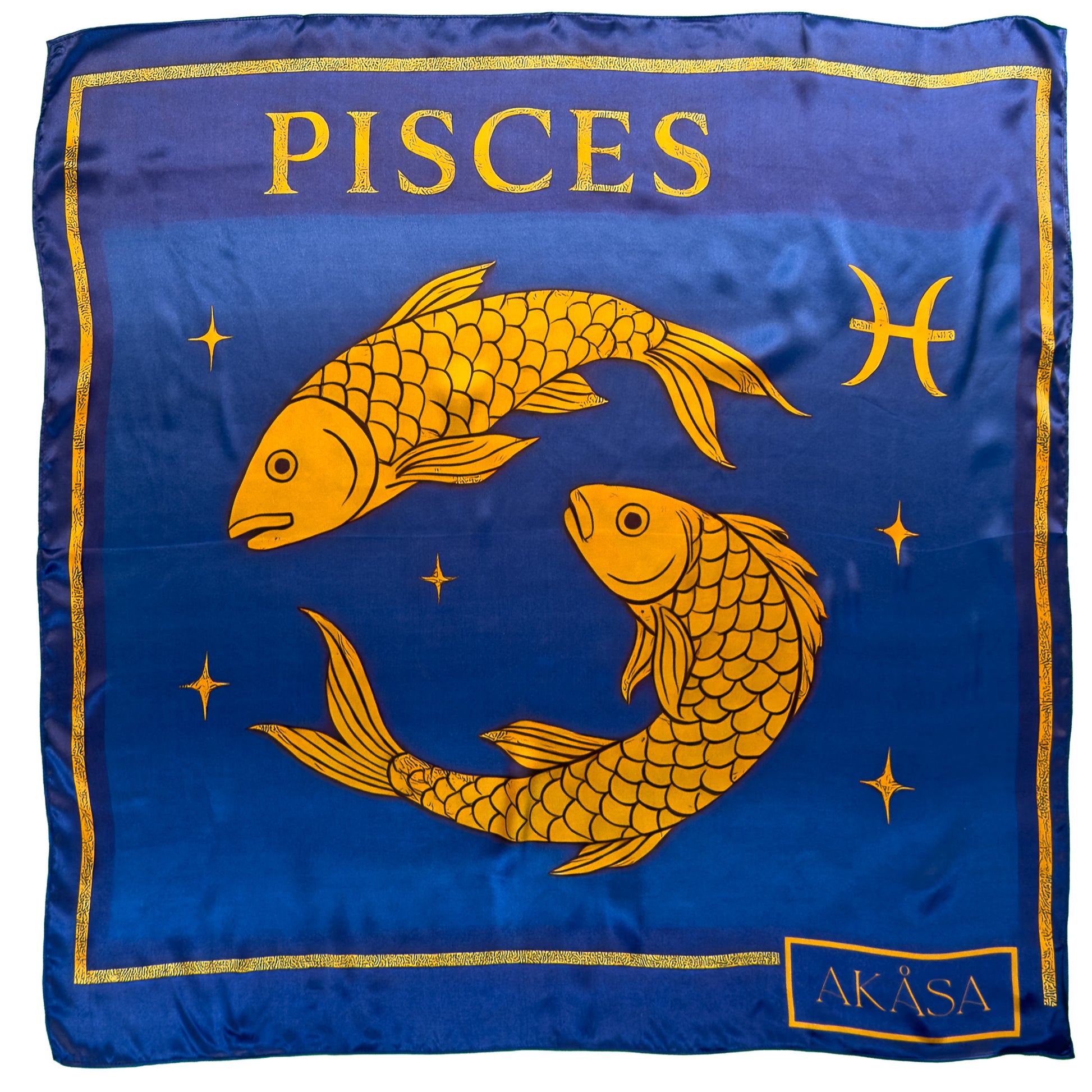 Zeichen: Fische - Inkarnation von Intuition und Empfindlichkeit unter der Ägis von kosmischem Wasser. Dieser Zodia Essentia Square zeigt zwei goldene Fische, die in Harmonie in einem tiefen Ozeanblau schwimmen. Es besteht aus Seidensatin 12 Momen (100 % natürliche Seide, OuKo-Tex® Standard 100), misst 88 × 88 cm und wird auf einer Seite gedruckt (gedrucktes Rekto • United Blue Ton-sur-Ton).