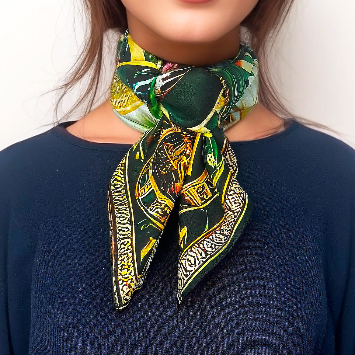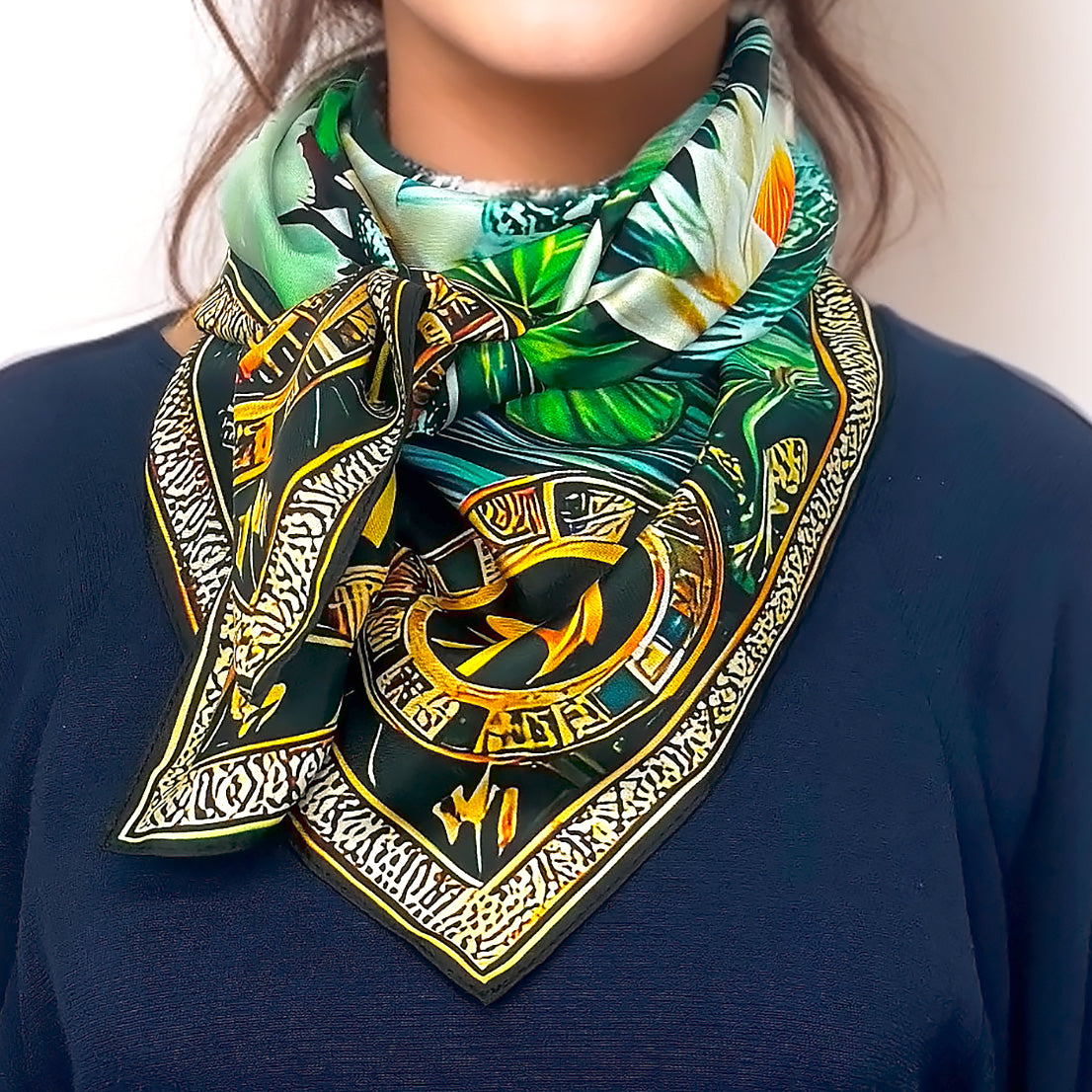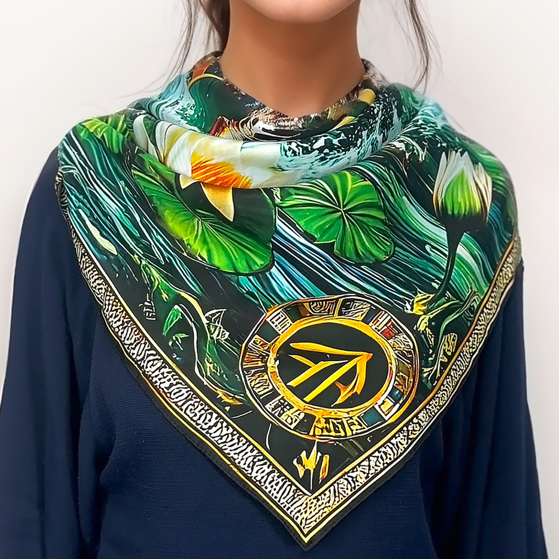 Immerse yourself in the primordial power of Sobek, the crocodile god of ancient Egypt. Protector of the waters and master of fertility, he embodies power, abundance and courage. This 88 × 88 cm silk square in 16 momme silk twill, certified OEKO-TEX®, expresses the intensity of his vital energy and the richness of the nourishing rivers.