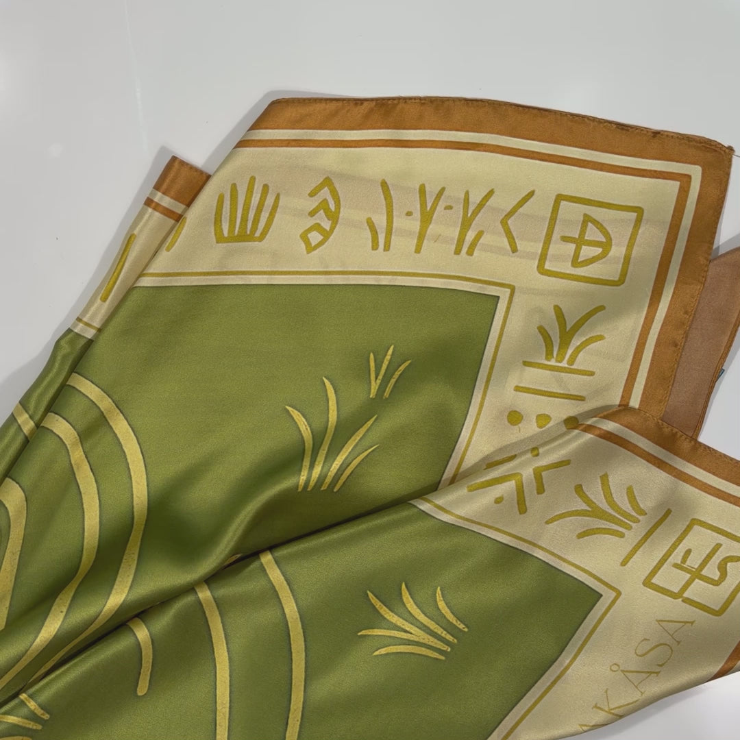 The frame of ancient hieroglyphs and the earth/olivine palette reinforce the organic, grounded and humbly sacred dimension of this scarf.