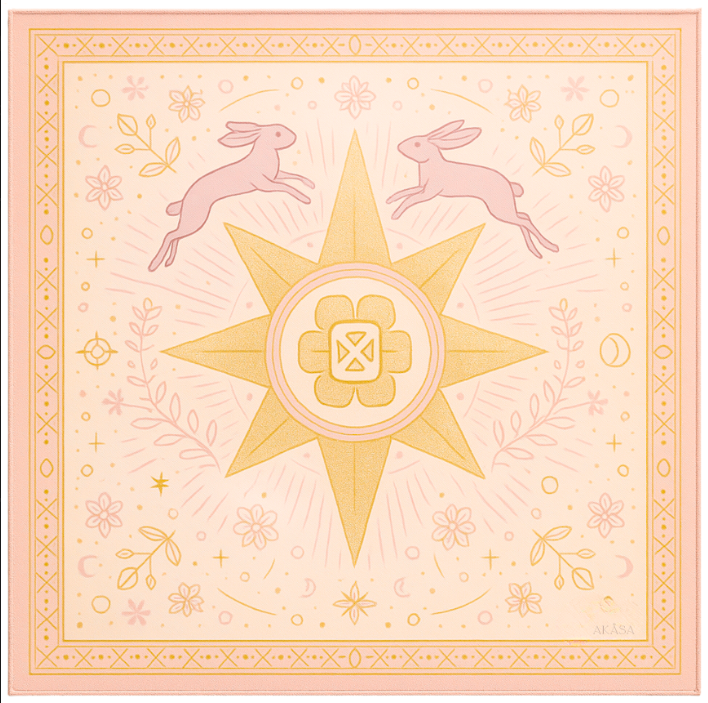 Two twin rabbits leap around it, symbols of fertility, joy, and lunar cycles.