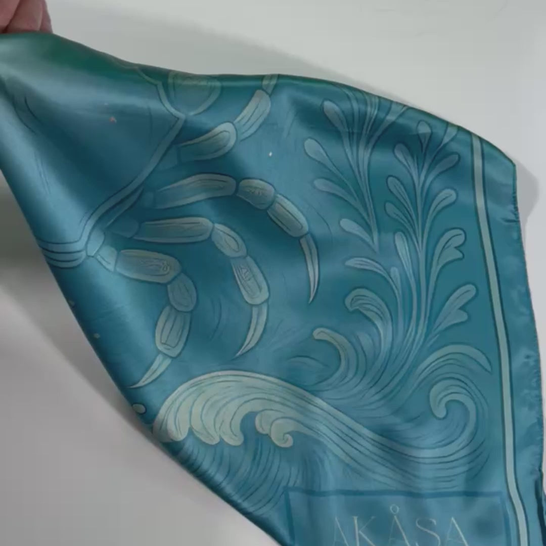 Carré 88 × 88 cm en satin de soie 12 mommes (impression une face). Le dessin représente un crabe stylisé sous la lune croissante, au cœur d’un océan calme et vivant. Le fond, dans un dégradé de bleus célestes et profonds, évoque la fluidité et la mémoire de l’eau. Feuillages marins, vagues et étoiles s’entrelacent pour incarner la sensibilité du signe et sa force protectrice.