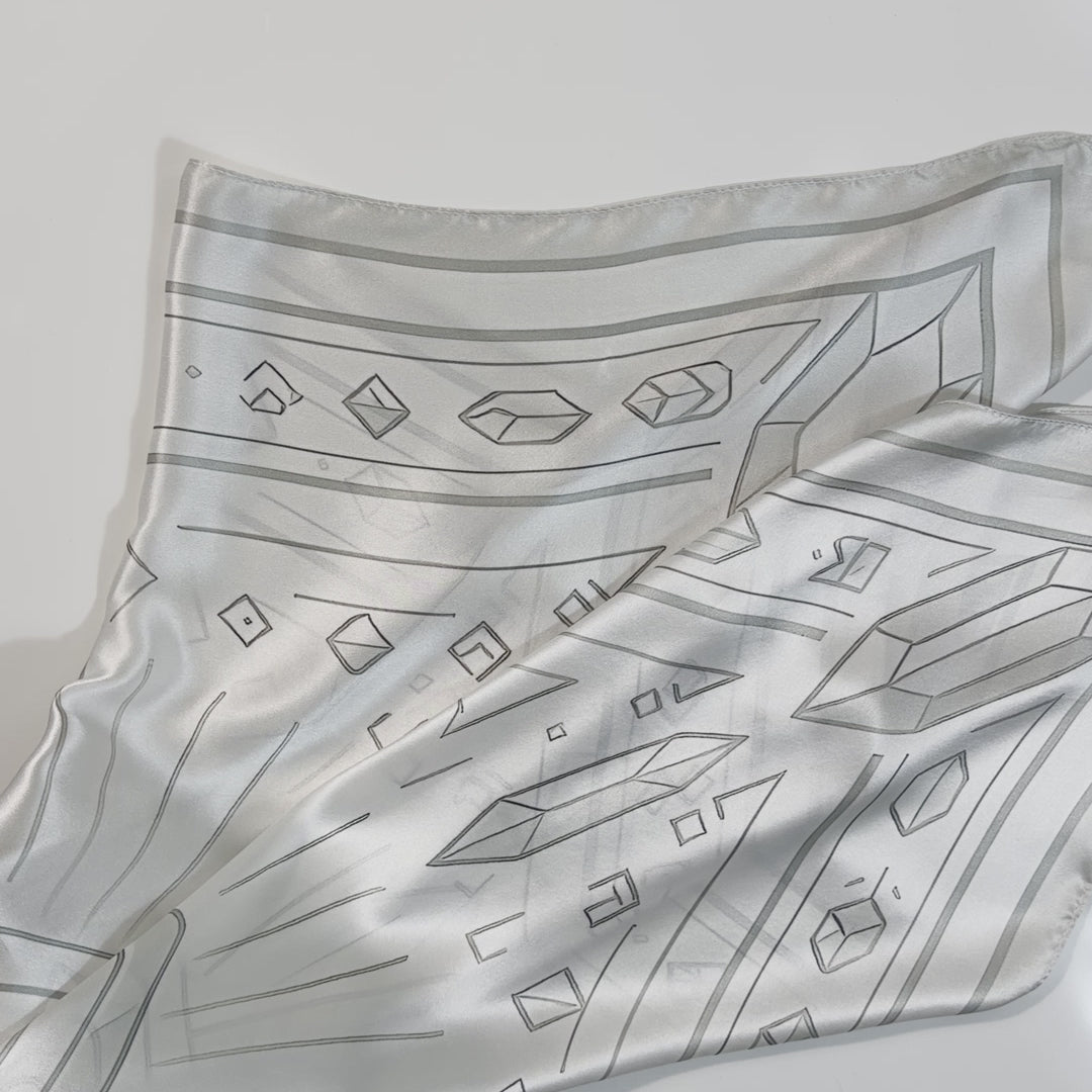 Sur un fond argent nacré et lumineux, les motifs gris acier se déploient comme des cristaux d’énergie. L’épée centrale devient un axe de vérité — à la fois ancrage et éveil. Porté près du cœur ou en turban, il offre une sensation de fraîcheur et de légèreté, comme une lumière qui purifie les pensées.