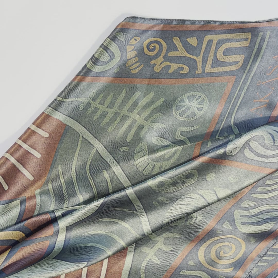 Son fond ocre terre cuite se marie à des motifs verts profonds et beiges, créant une harmonie naturelle et organique. Porté au cou, il évoque la stabilité intérieure. Sur les épaules, il devient symbole d’ancrage, de respect et de lenteur consciente dans le mouvement de la vie.
