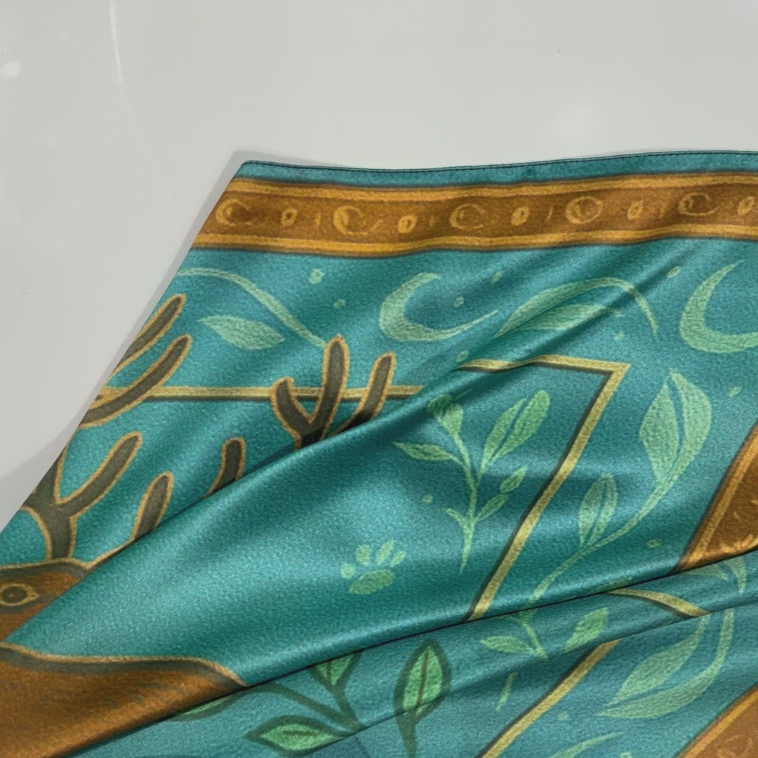 Ce carré 88 × 88 cm en satin de soie 12 mommes est une invitation à la paix intérieure et à la régénération. Le signe MANIK, symbole de la main guérisseuse, relie la conscience à la matière. Le cerf, figure noble et tranquille, incarne la sérénité et la douceur du mouvement. Ensemble, ils forment un équilibre sacré entre don, guérison et nature.