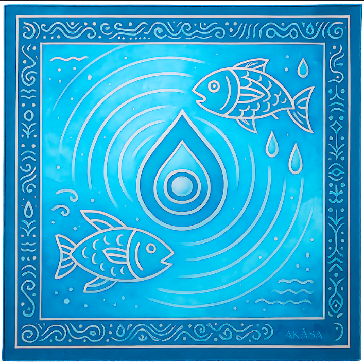 La palette bleu turquoise profond et l’écriture fluide des motifs évoquent la fraîcheur, la transparence et la mémoire des eaux anciennes.