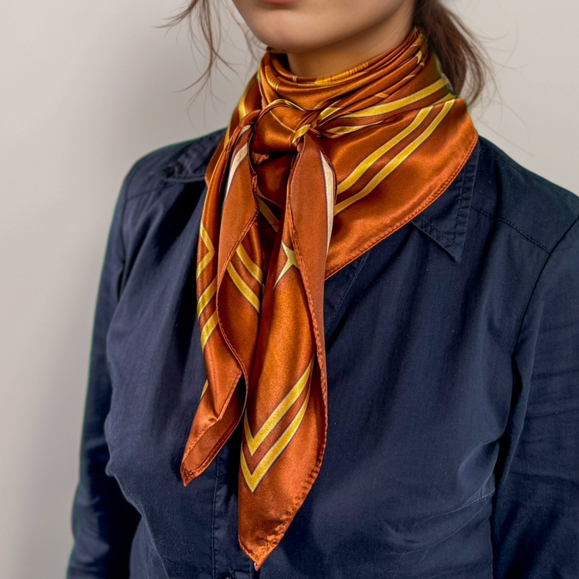 Avec son éclat ambré, le foulard Sagittaire magnifie les peaux dorées et les tenues automnales. Il s’accorde parfaitement avec le beige, le noir, le blanc cassé ou le bleu marine. Porté autour du cou ou sur les épaules, il devient symbole de liberté et d’élan spirituel.