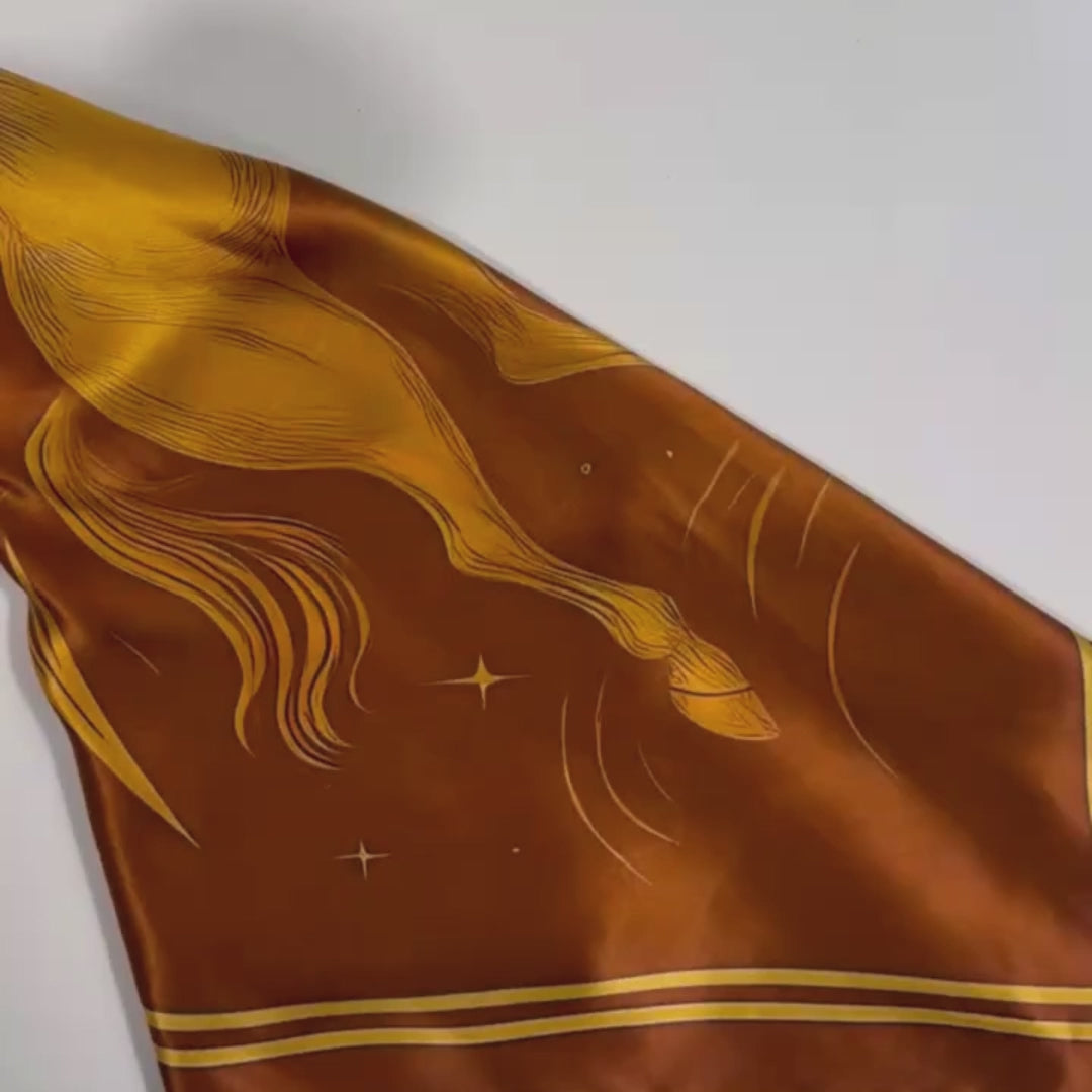 Carré 88 × 88 cm en satin de soie 12 mommes, imprimé sur une face. Au centre, le centaure doré tire sa flèche vers le ciel, symbole de quête, d’élévation et de vérité intérieure. L’arrière-plan, entre cuivre chaud et or solaire, évoque la lumière de la sagesse et la force du feu maîtrisé. Les contours rayonnants et la constellation du Sagittaire ajoutent une dimension cosmique et intemporelle à ce foulard puissant et inspirant.