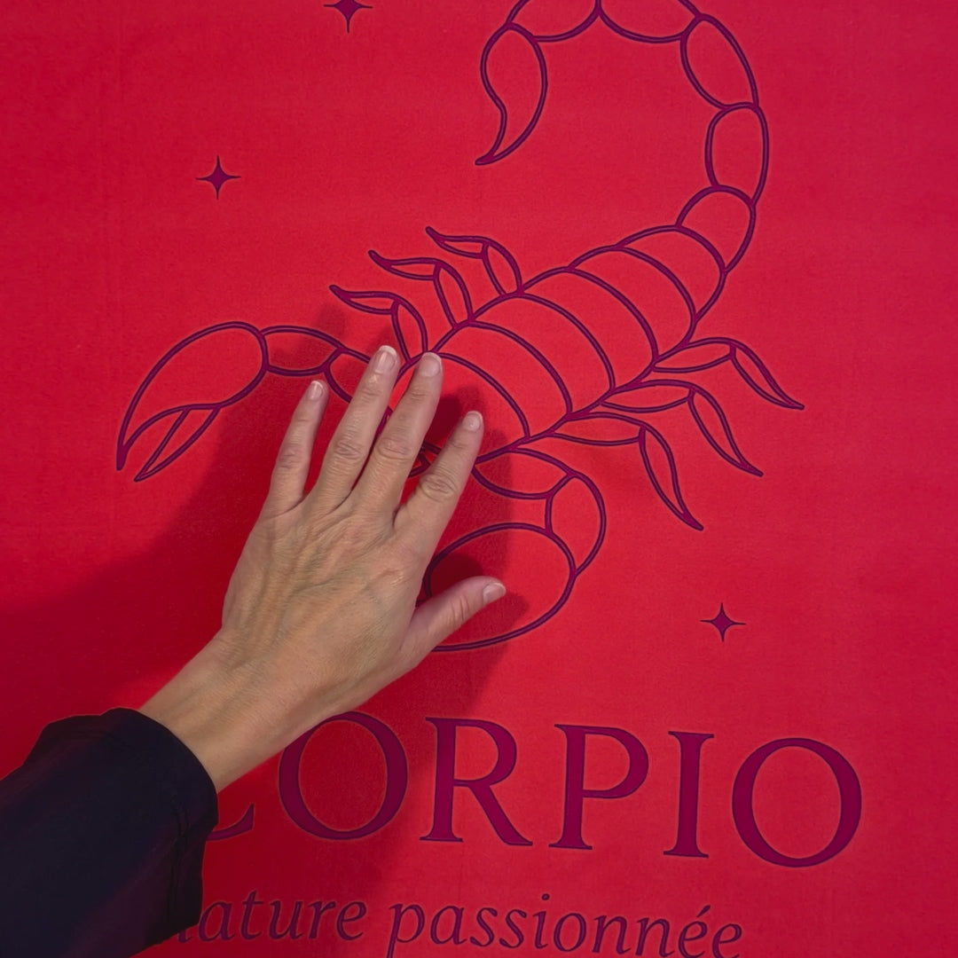 SCORPIO est le signe de l’intensité, du mystère et de la passion. Avec son rouge profond et son scorpion délicatement tracé, ce foulard révèle une personnalité magnétique, intuitive et impossible à ignorer. Un accessoire pour celles et ceux qui vivent tout… pleinement.