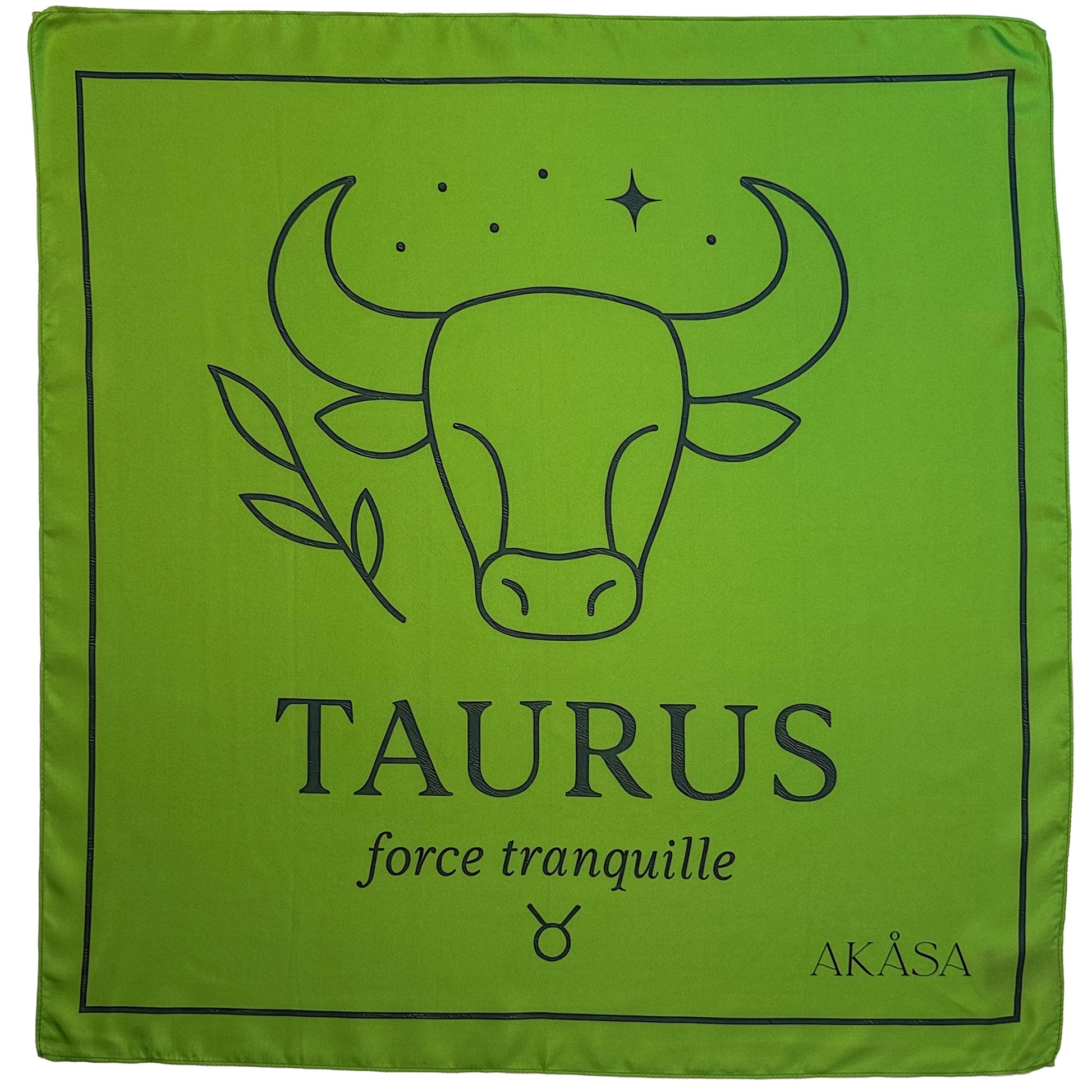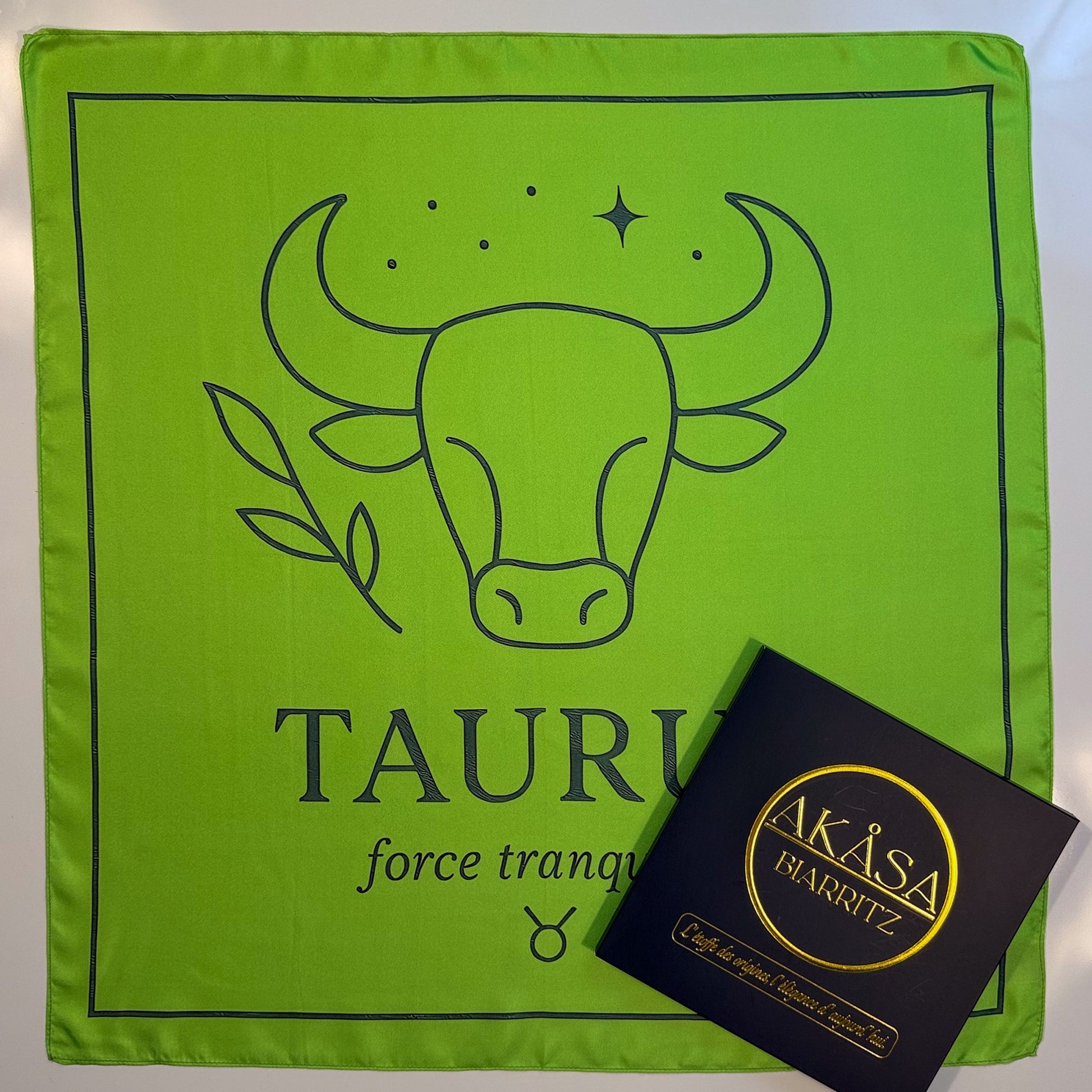 TAURUS symbolise la douceur, la stabilité et le sens du beau. Avec son vert vibrant et son taureau dessiné d’un trait fin, ce foulard incarne la force calme et la sensibilité naturelle du Taureau. Un accessoire parfait pour celles et ceux qui aiment la simplicité chic et l’énergie apaisante.