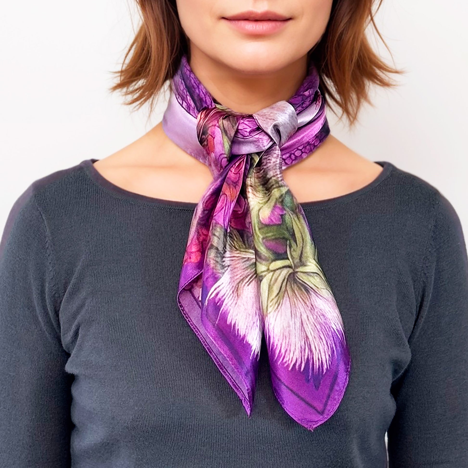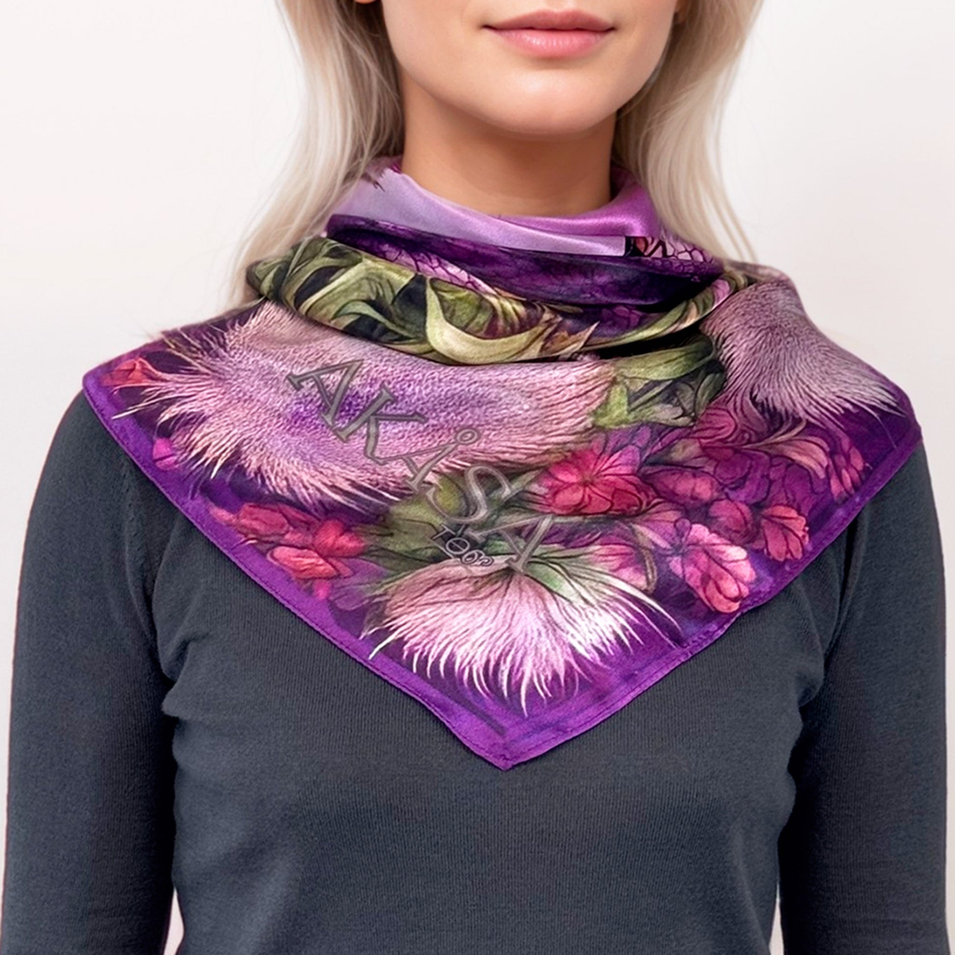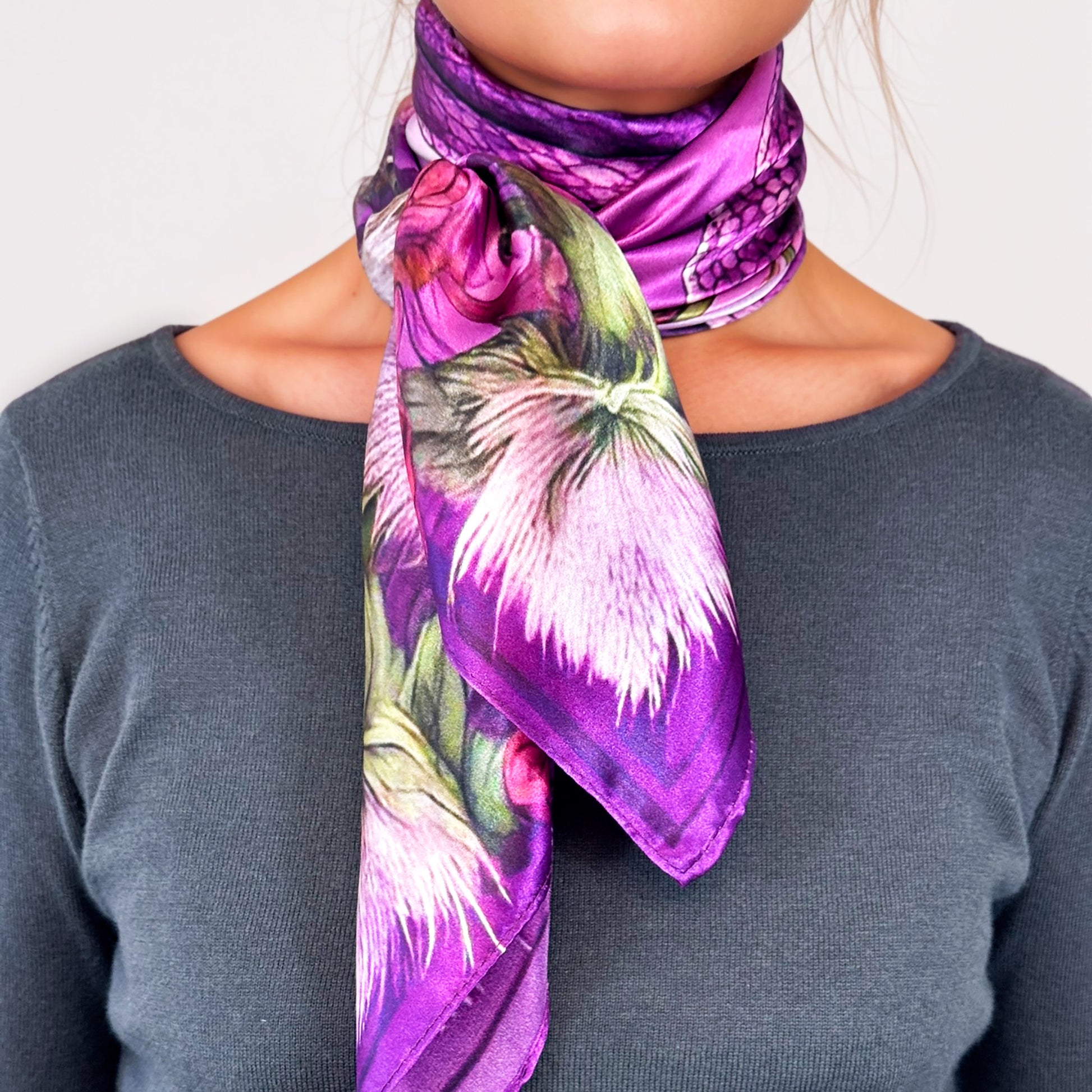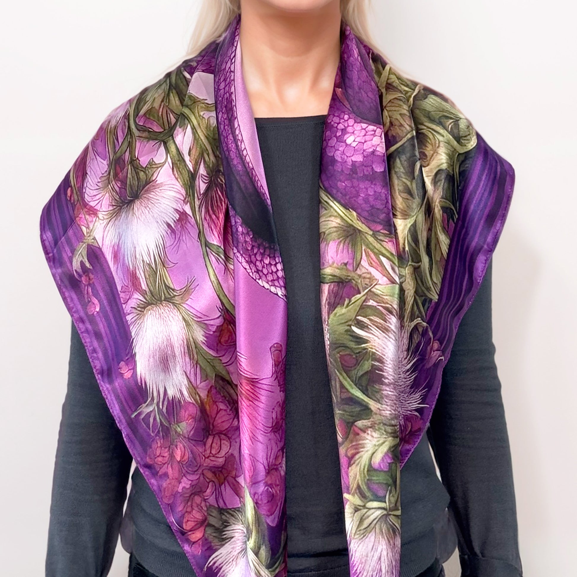 Réalisé en satin de soie 12 mommes certifié OEKO-TEX®, ce carré 88 cm séduit par sa légèreté raffinée et son éclat lumineux. Ses motifs vibrants évoquent la mue du serpent, symbole de renouveau et de force intérieure.