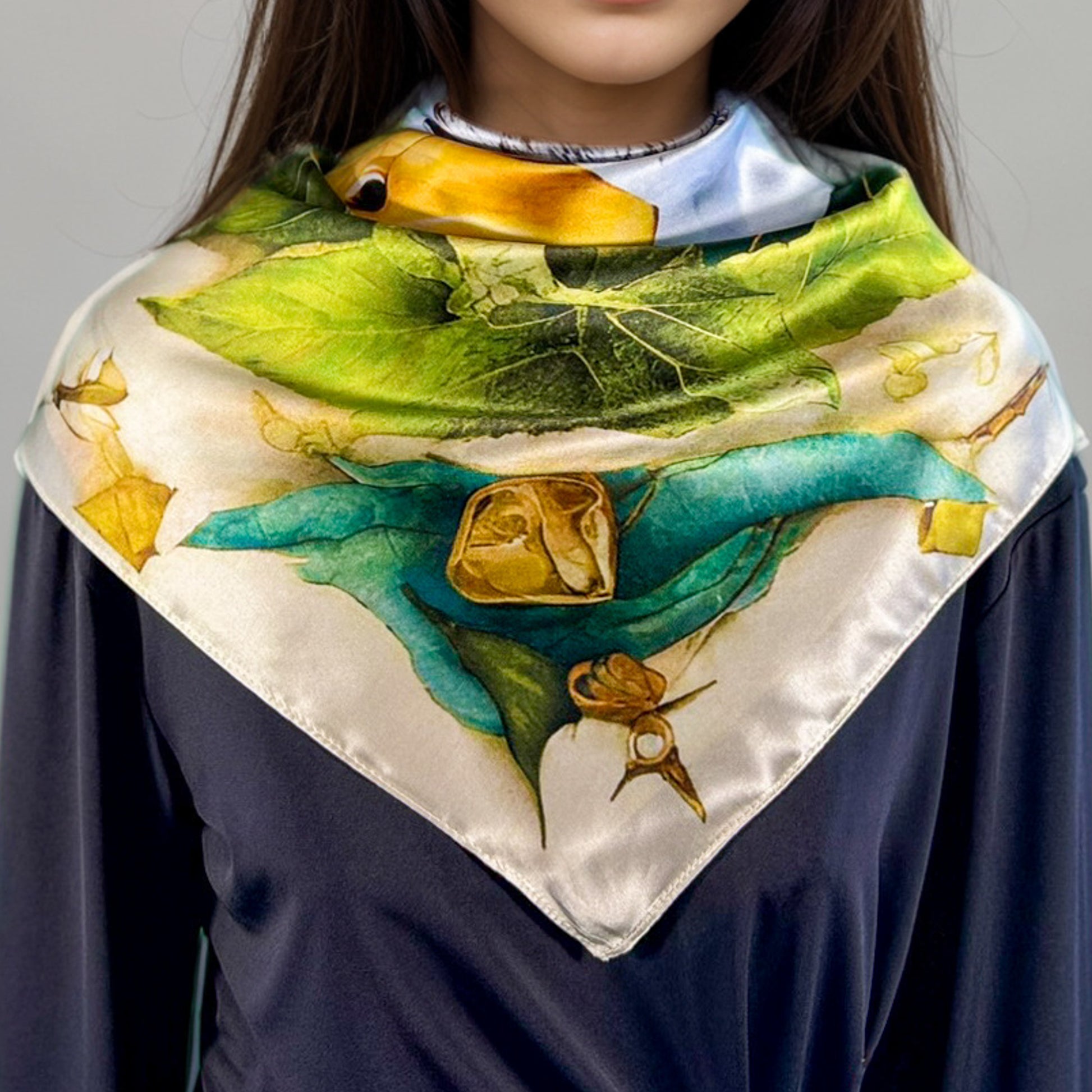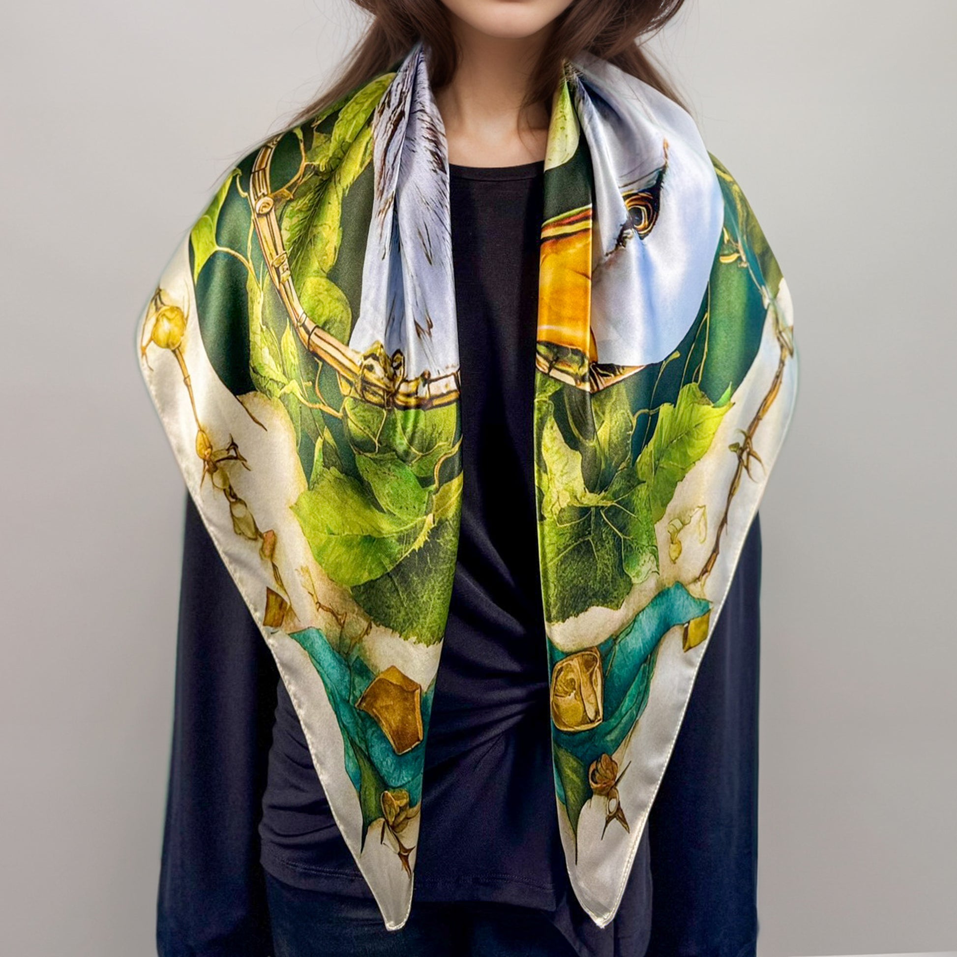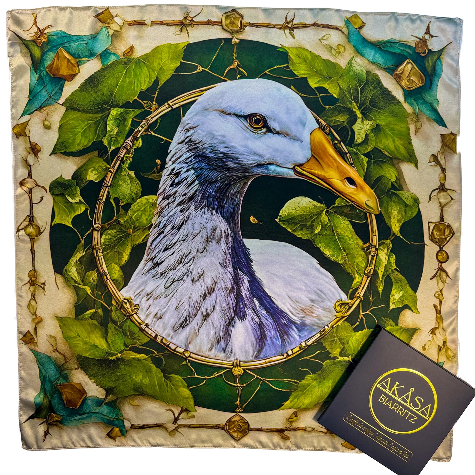 Ce carré 88 × 88 cm en satin de soie 12 mommes évoque la pureté du regard et la force tranquille de l’hiver. Sur un fond vert forêt profond se détache une oie argentée aux reflets bleus, entourée d’un cadre végétal doré et turquoise. Les feuilles de vigne symbolisent la continuité du cycle de vie, tandis que la géométrie du cercle central reflète la constance et la discipline intérieure. Ce foulard incarne la clarté d’esprit, la rigueur noble et la sérénité du cœur aligné.