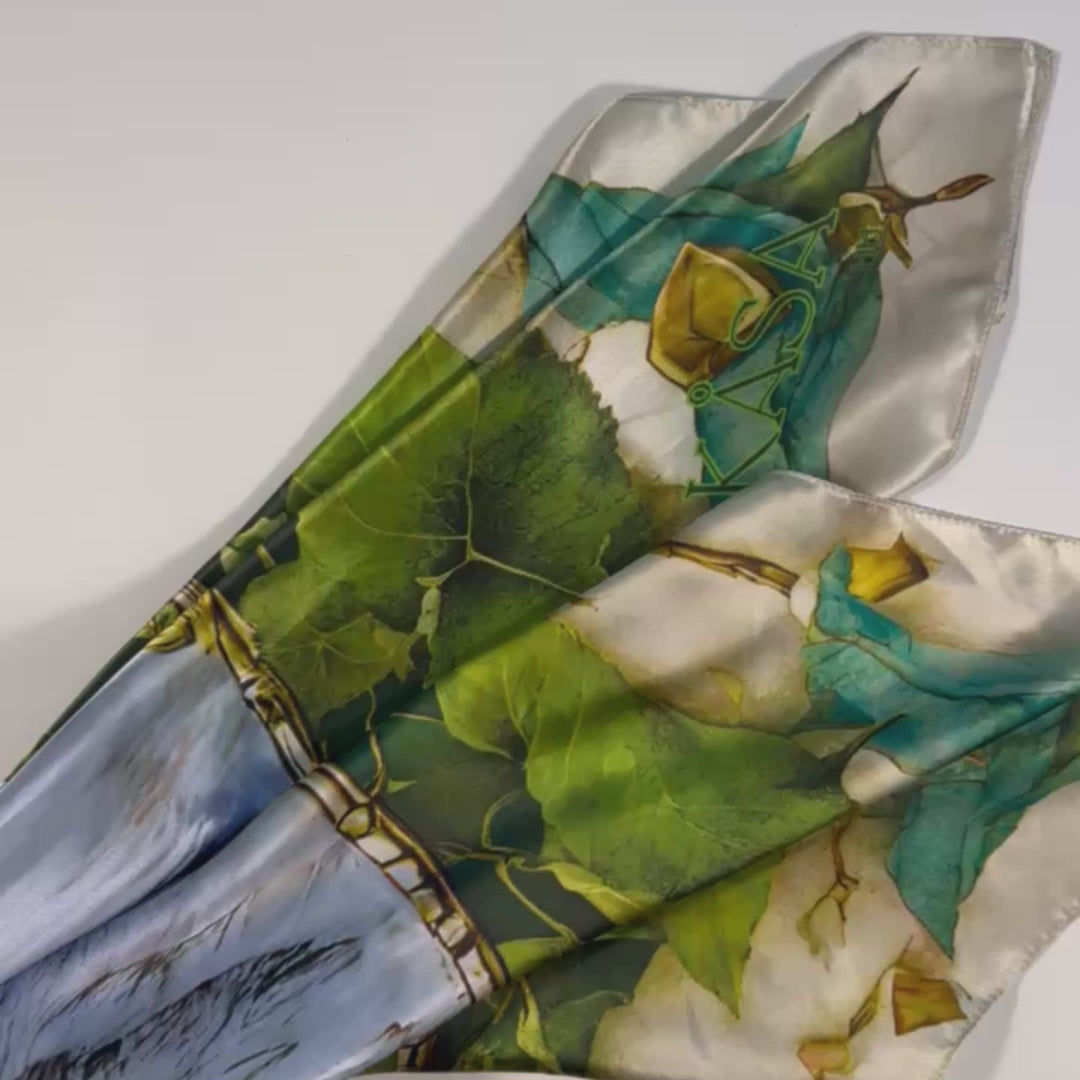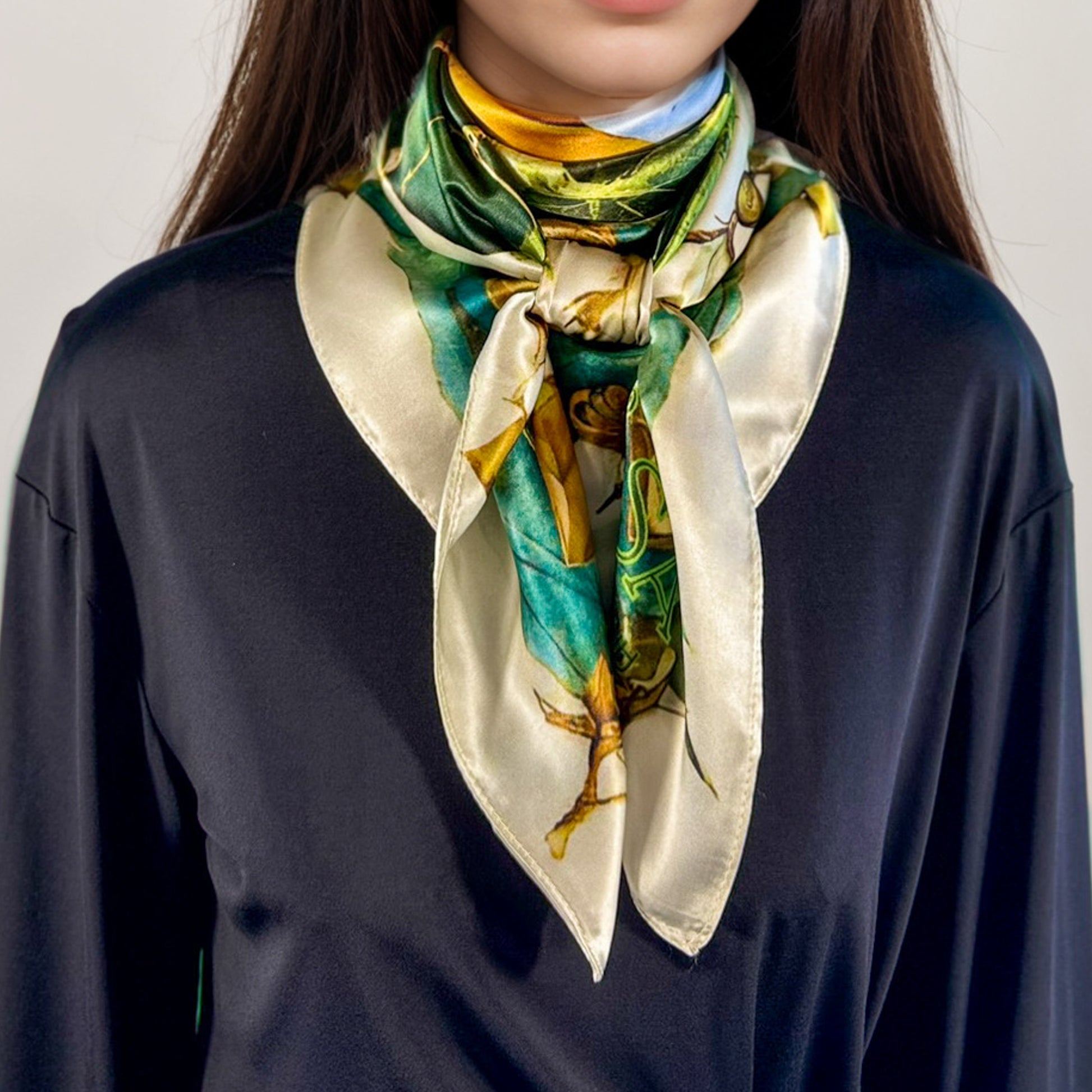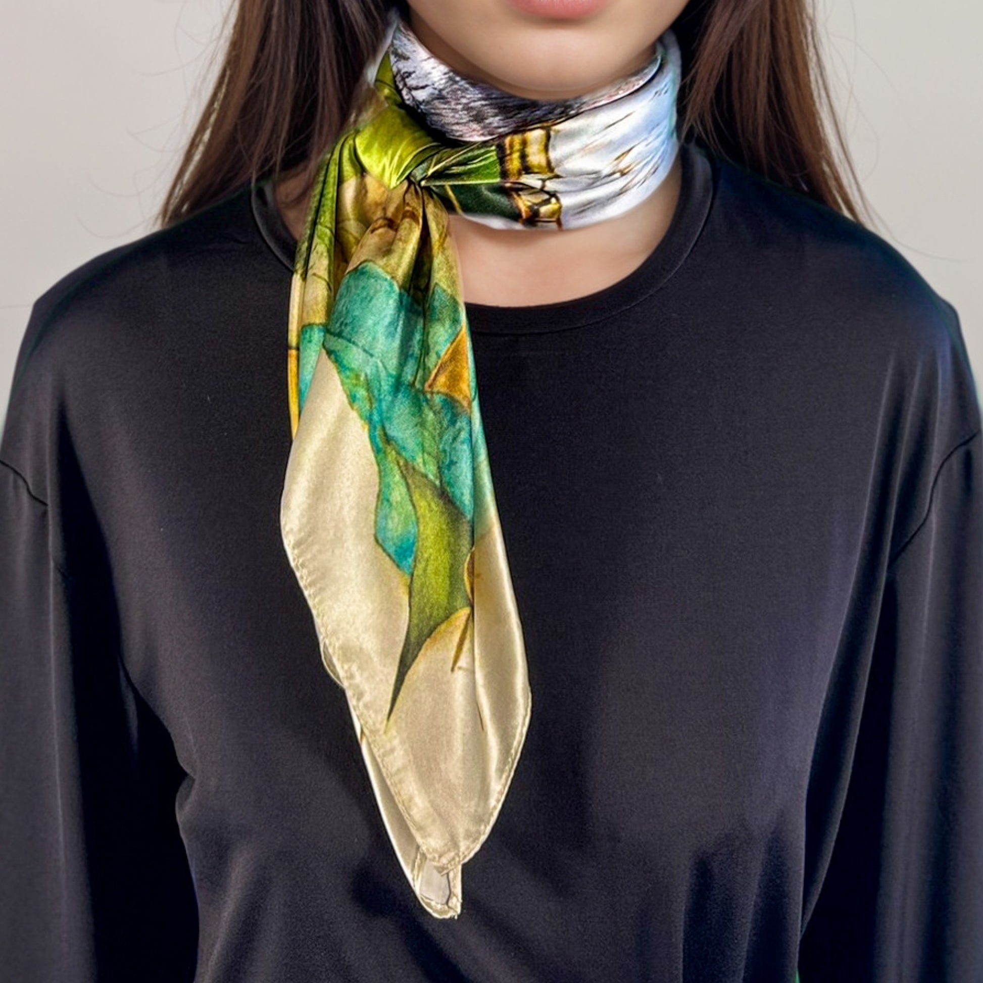 Ce carré 88 × 88 cm en satin de soie 12 mommes évoque la pureté du regard et la force tranquille de l’hiver. Sur un fond vert forêt profond se détache une oie argentée aux reflets bleus, entourée d’un cadre végétal doré et turquoise. Les feuilles de vigne symbolisent la continuité du cycle de vie, tandis que la géométrie du cercle central reflète la constance et la discipline intérieure. Ce foulard incarne la clarté d’esprit, la rigueur noble et la sérénité du cœur aligné.