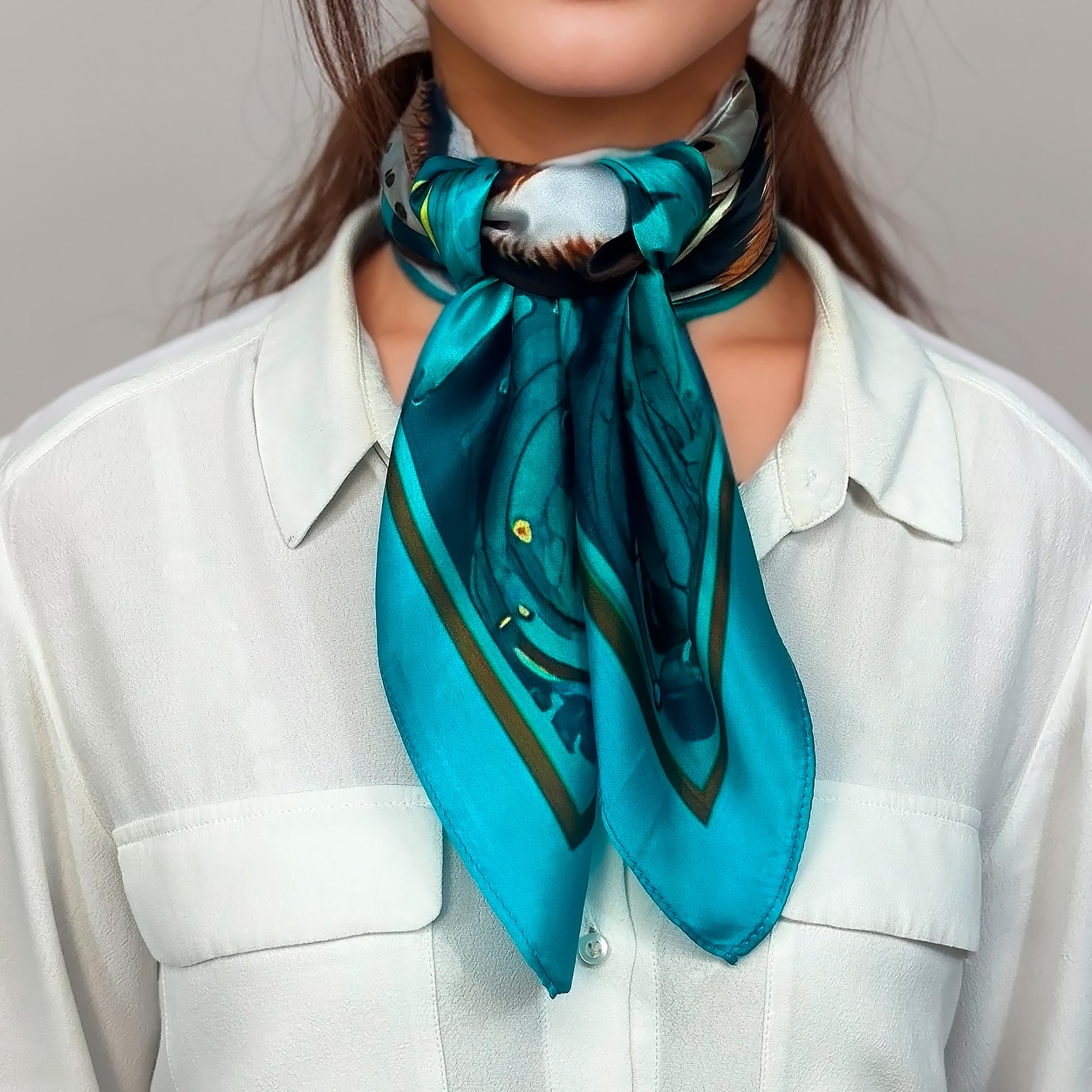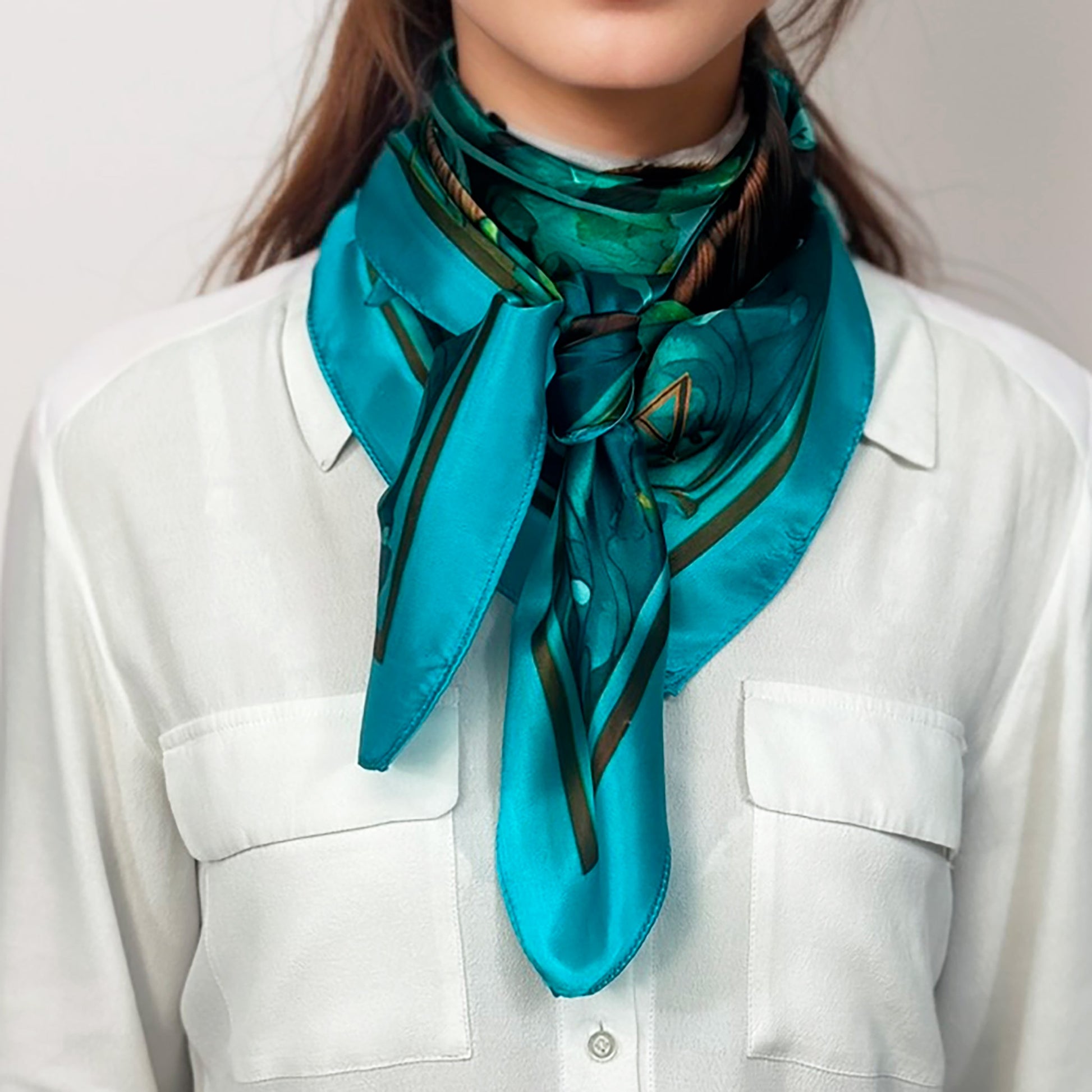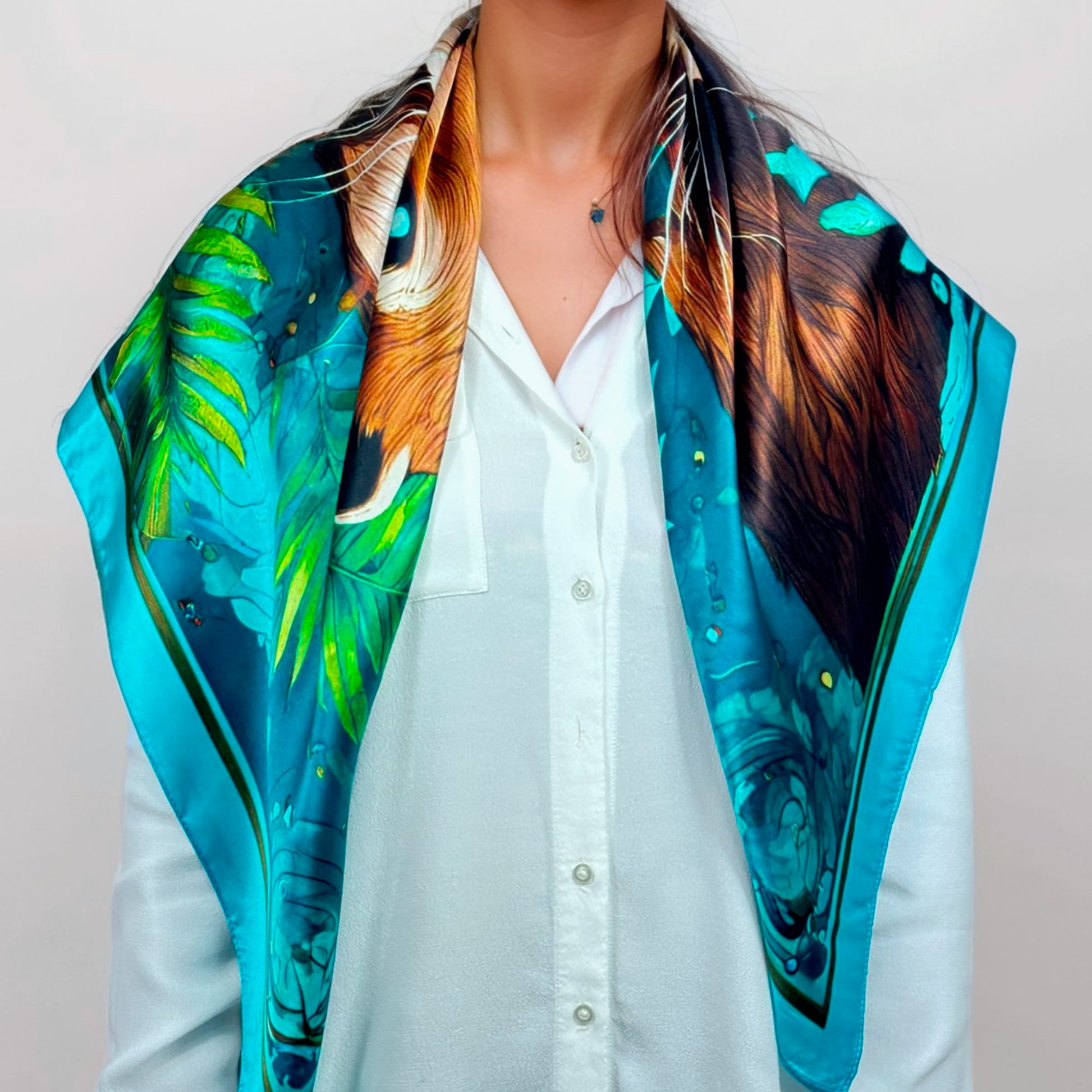 Confectionné en satin de soie 12 mommes certifié OEKO-TEX®, ce carré de 88 cm combine éclat lumineux et fluidité soyeuse. Imprimé sur une face, il allie design inspiré et confort naturel pour devenir un accessoire à la fois élégant et porteur de sens.