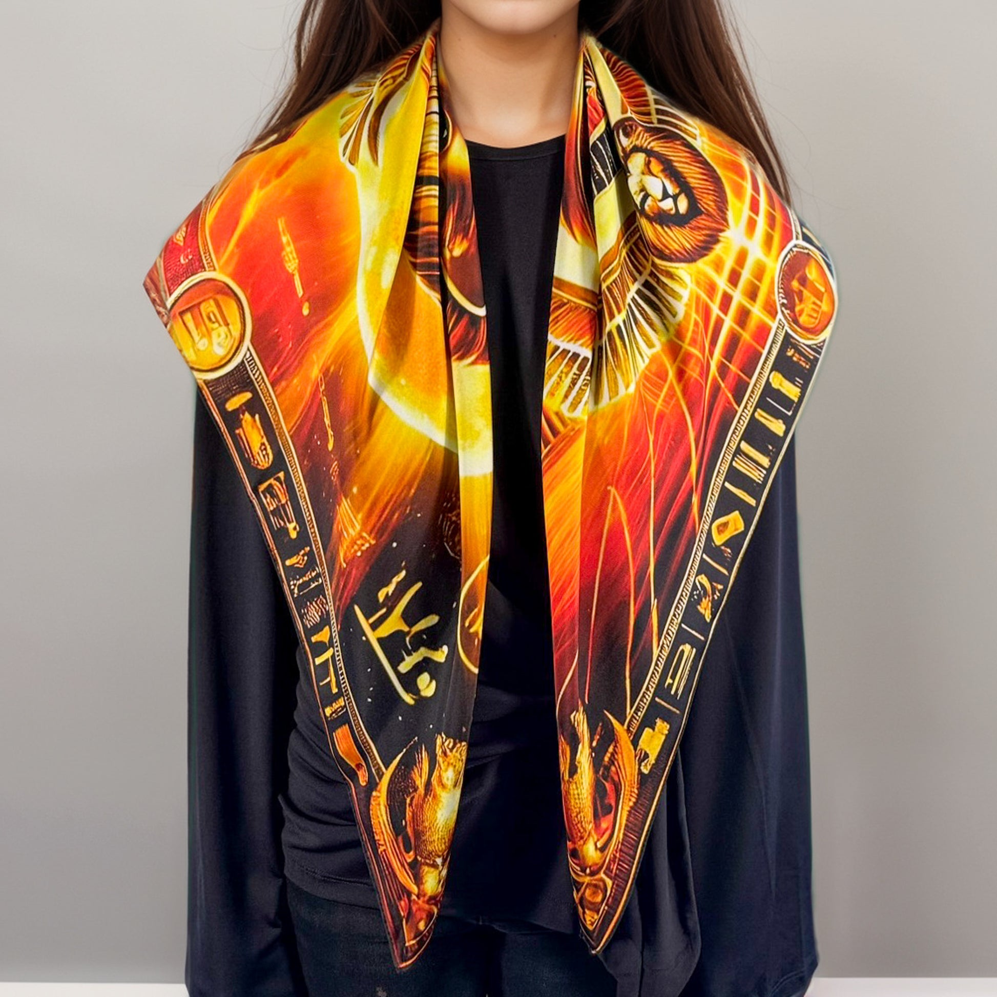 Le lion doré, irradié par la lumière du disque solaire, représente la puissance protectrice et la clarté intérieure. Les ailes étendues symbolisent l’amour inconditionnel qui veille sur la création. Ce foulard rend hommage à la matrice universelle : la Mère divine qui nourrit et protège sans jamais dominer.