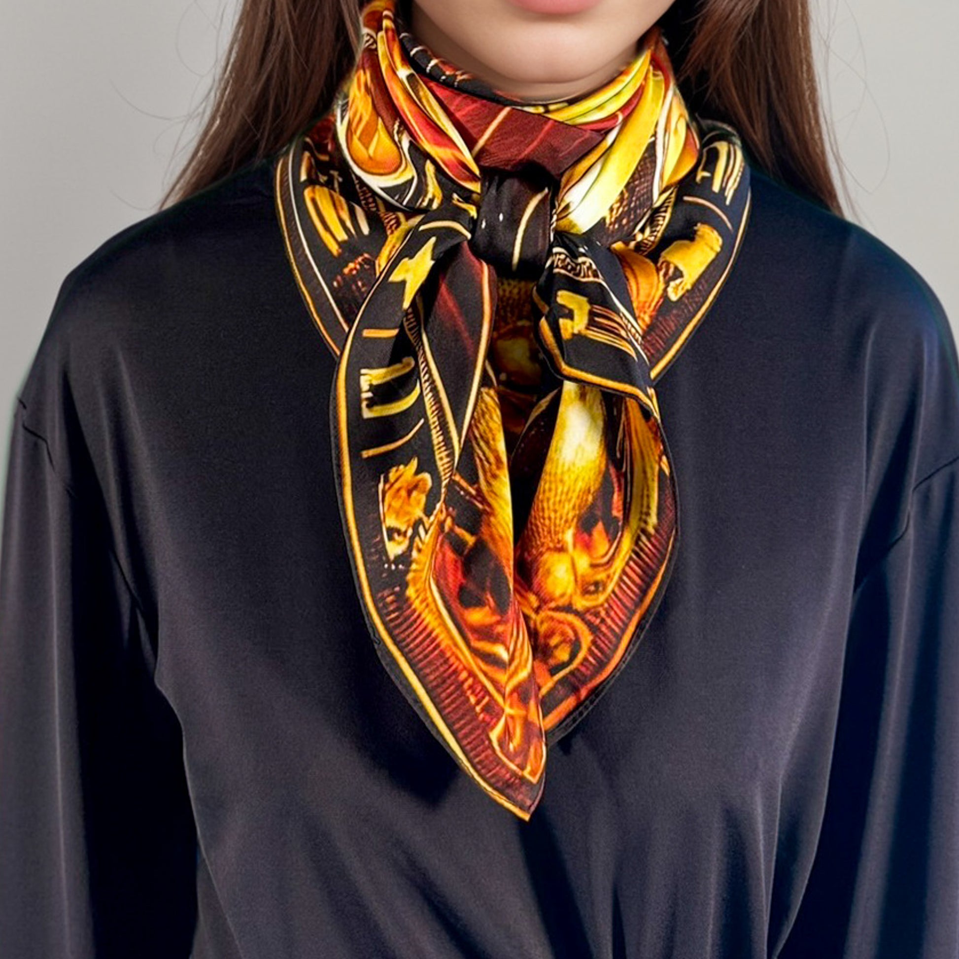 Porté sur les épaules, il enveloppe d’une énergie protectrice. Noué au cou, il affirme une force douce et souveraine. En turban, il évoque la sagesse intérieure et la chaleur du Soleil originel.